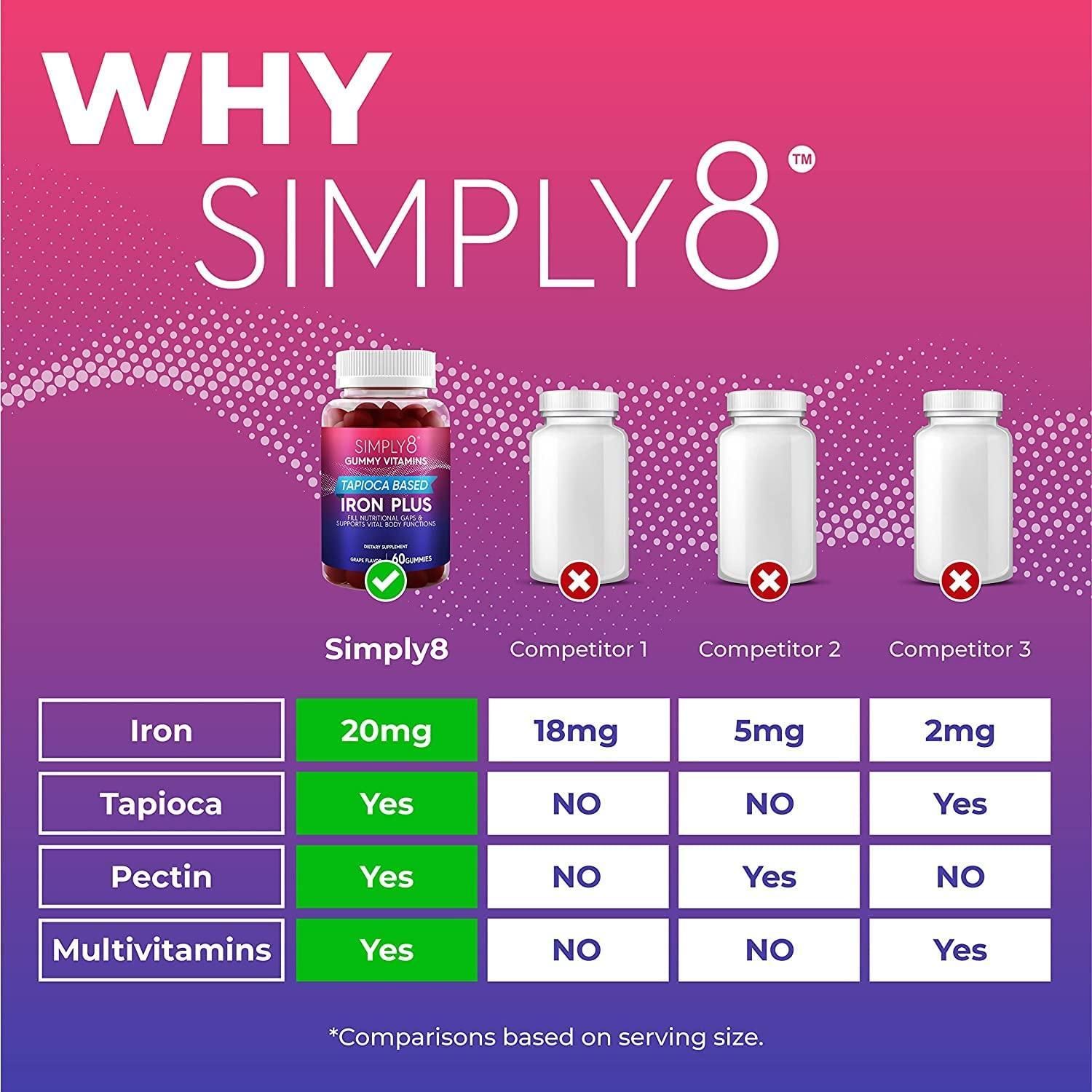 3.the natural simply8 formula is tapioca-based, vegetarian and cruelty-free. made with only natural colors. kosher and halal. these pure and potent pectin gummies are laboratory tested.