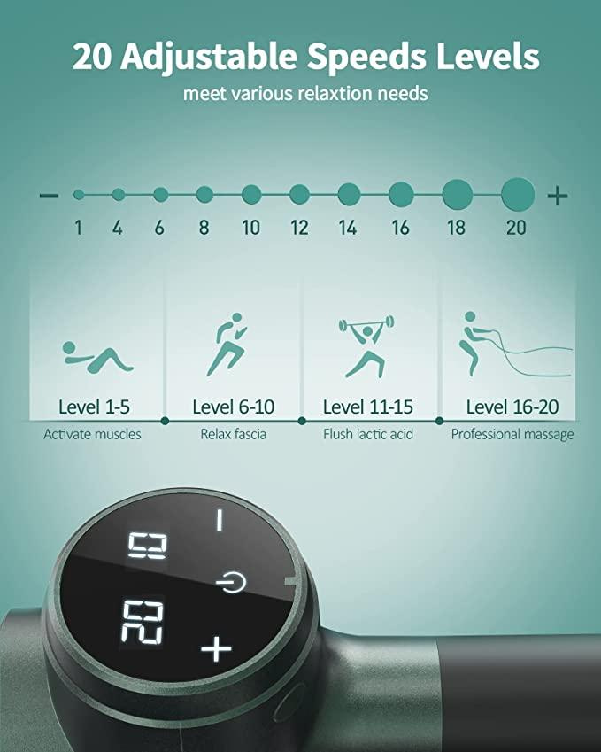 • LED Touch Screen - The muscle gun massager designed with a LED touch screen clearly displays the speed level and electricity.