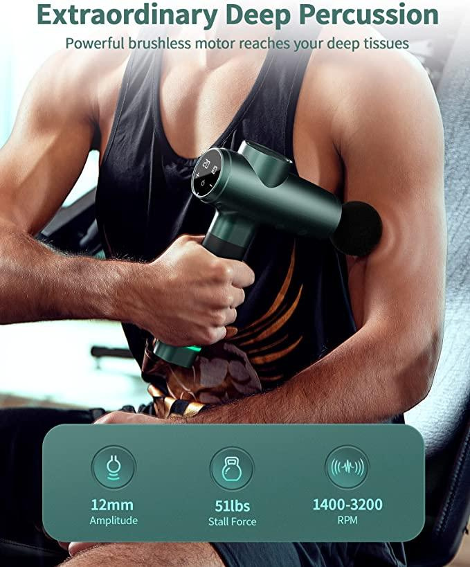 • Super Quiet Brushless Motor - The brushless motor of this muscle massage gun adopts the latest noise reduction technology to reduce the noise to under 43dB while working; no worry about disturbing others.
